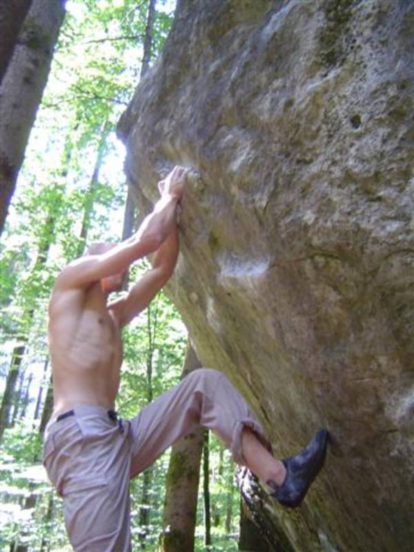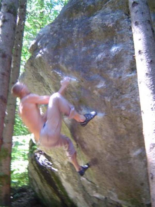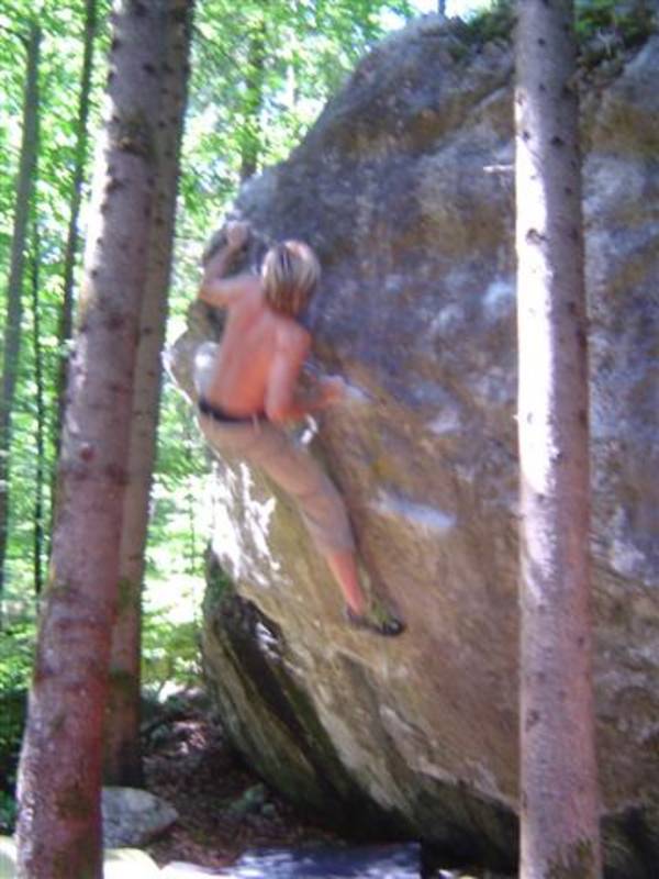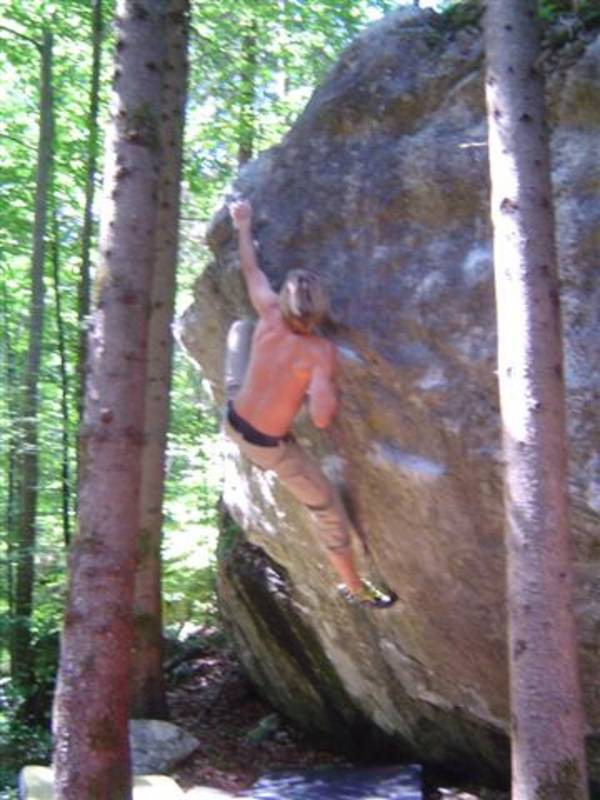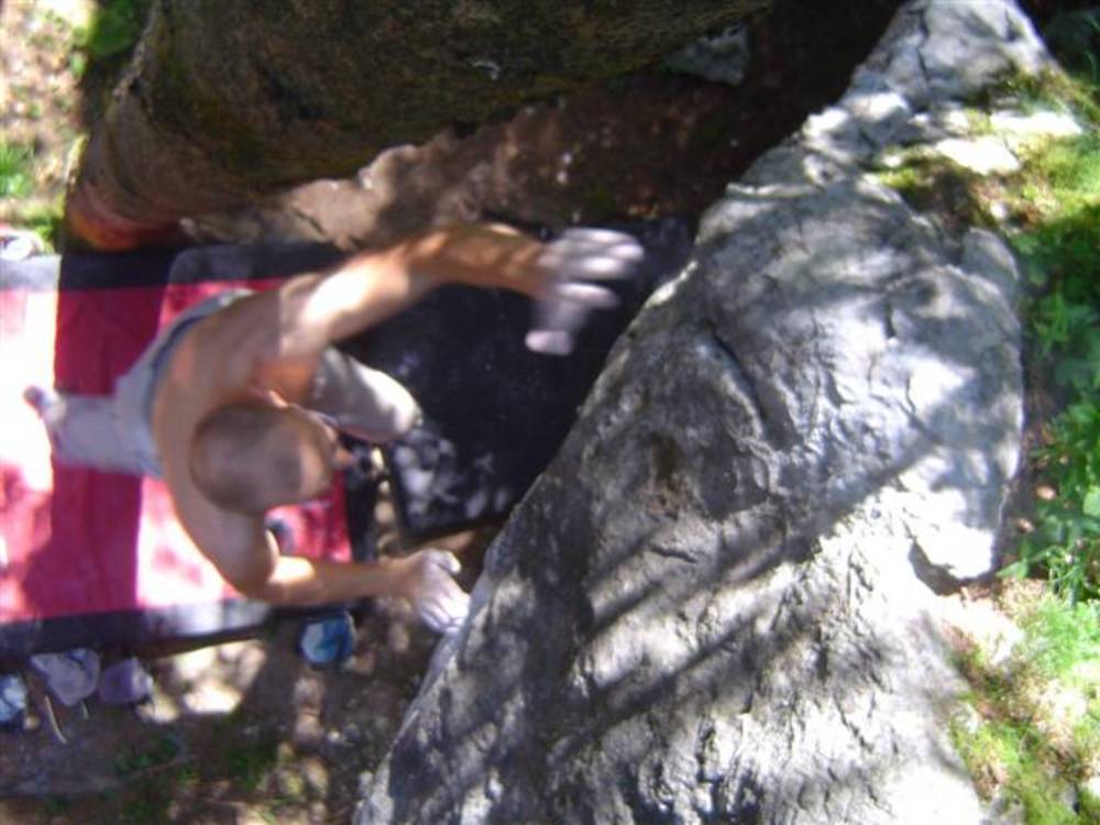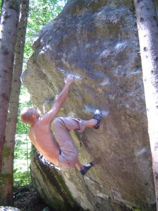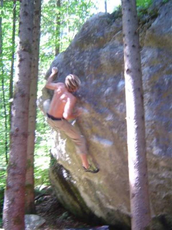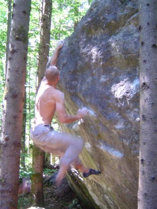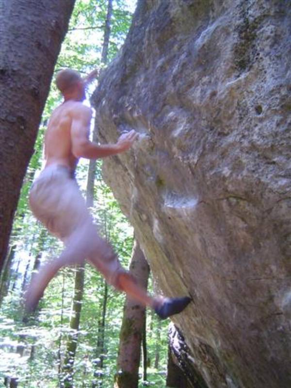 Also mir würde ja "Fuchswald" besser gefallen. Fuchsloch klingt irgendwie so abwertend für diese feine Umgebung. Im Sommer perfekt ,wenn mans ein wenig schattiger haben will. Mark,Hias,Steff und Ich flüchteten daher von der Hitze und holten uns ein wenig Abkühlung an einen der Schwaiger-Boulder,wenn man das so sagen kann. Nach einiger Zeit erinnerte mich das ganze an Chironico,wo Hias auch ganz versessen danach war,einen Mörder-Dynamo auszuführen. Ja, man muss schon noch weit über die Kante um Halt zu finden. (Bei den Pics von oben sieht man das gut) Ich versuchte mein Glück über eine Leiste zu der Ich mich schwer hin-blockieren musste. A wirklich lässiges Ding der Boulder,jedoch sehr defeniert.