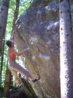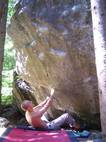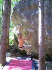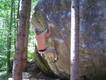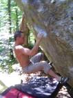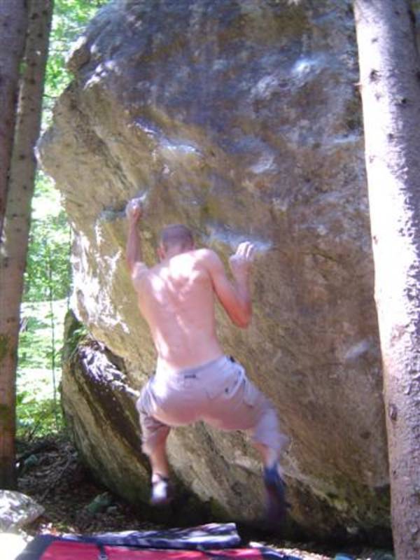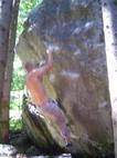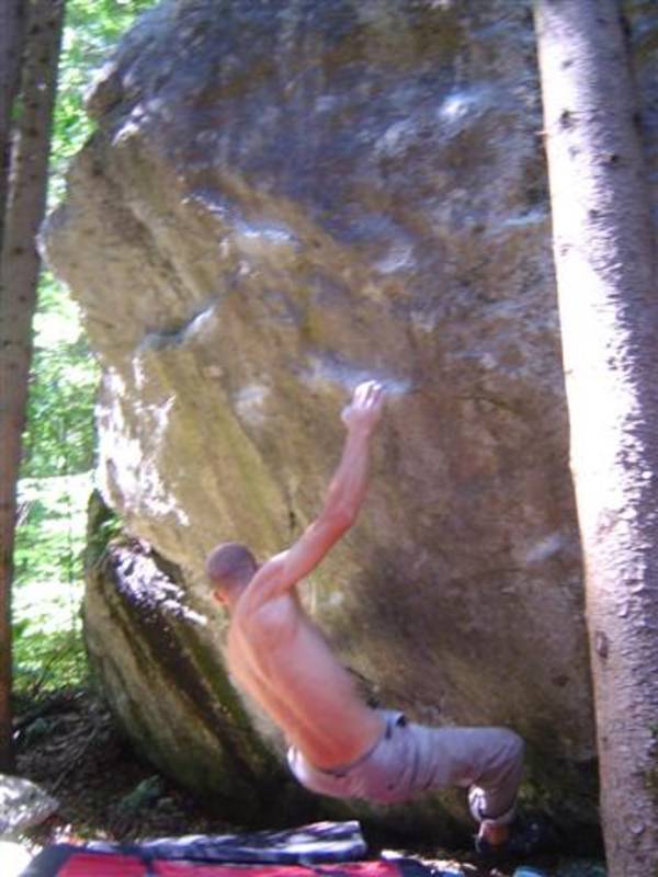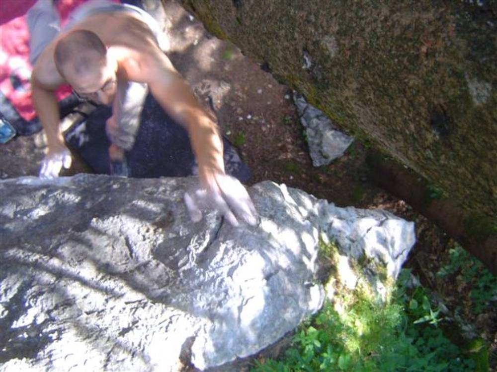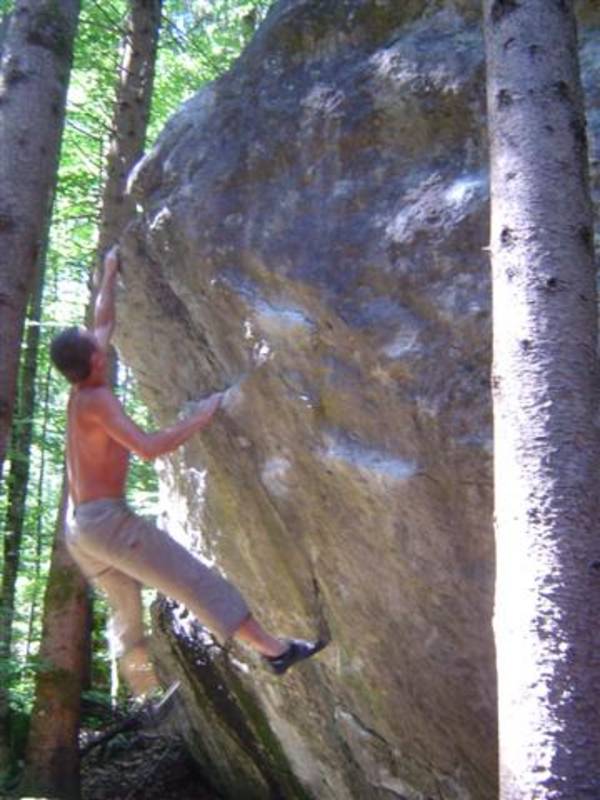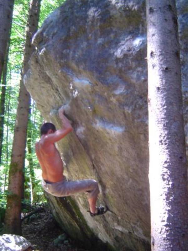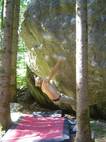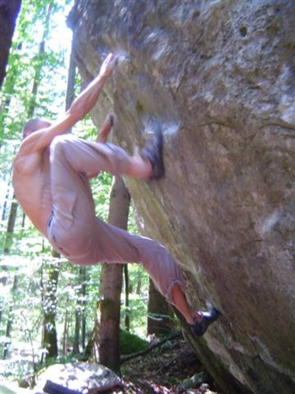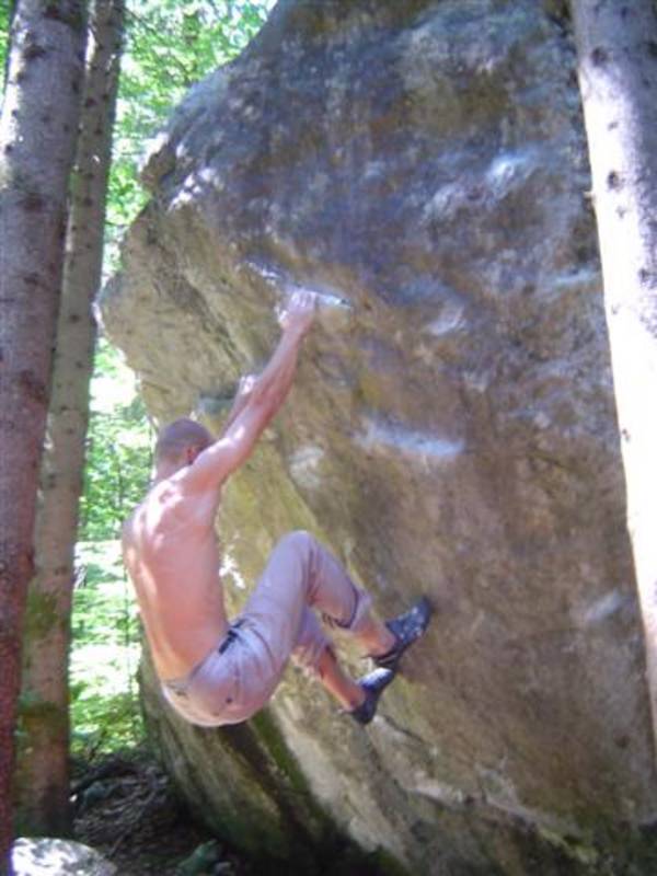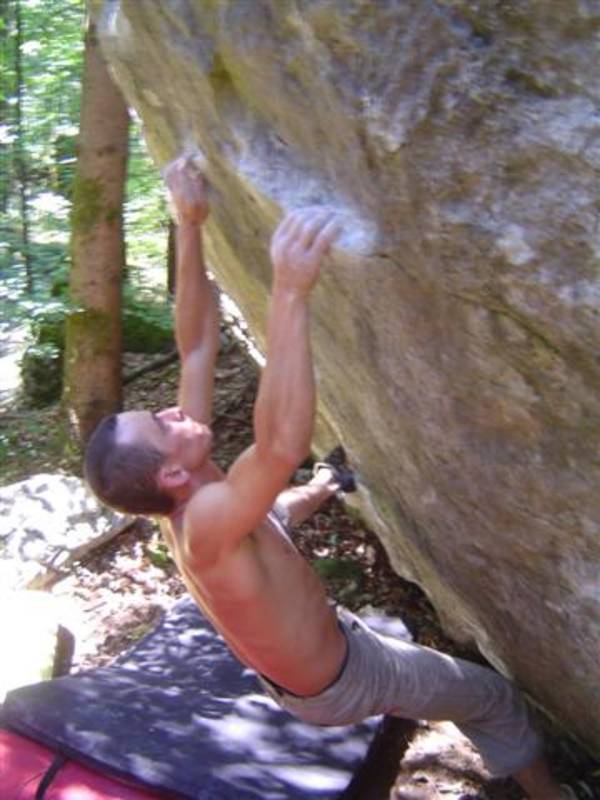 Also mir würde ja "Fuchswald" besser gefallen. Fuchsloch klingt irgendwie so abwertend für diese feine Umgebung. Im Sommer perfekt ,wenn mans ein wenig schattiger haben will. Mark,Hias,Steff und Ich flüchteten daher von der Hitze und holten uns ein wenig Abkühlung an einen der Schwaiger-Boulder,wenn man das so sagen kann. Nach einiger Zeit erinnerte mich das ganze an Chironico,wo Hias auch ganz versessen danach war,einen Mörder-Dynamo auszuführen. Ja, man muss schon noch weit über die Kante um Halt zu finden. (Bei den Pics von oben sieht man das gut) Ich versuchte mein Glück über eine Leiste zu der Ich mich schwer hin-blockieren musste. A wirklich lässiges Ding der Boulder,jedoch sehr defeniert.