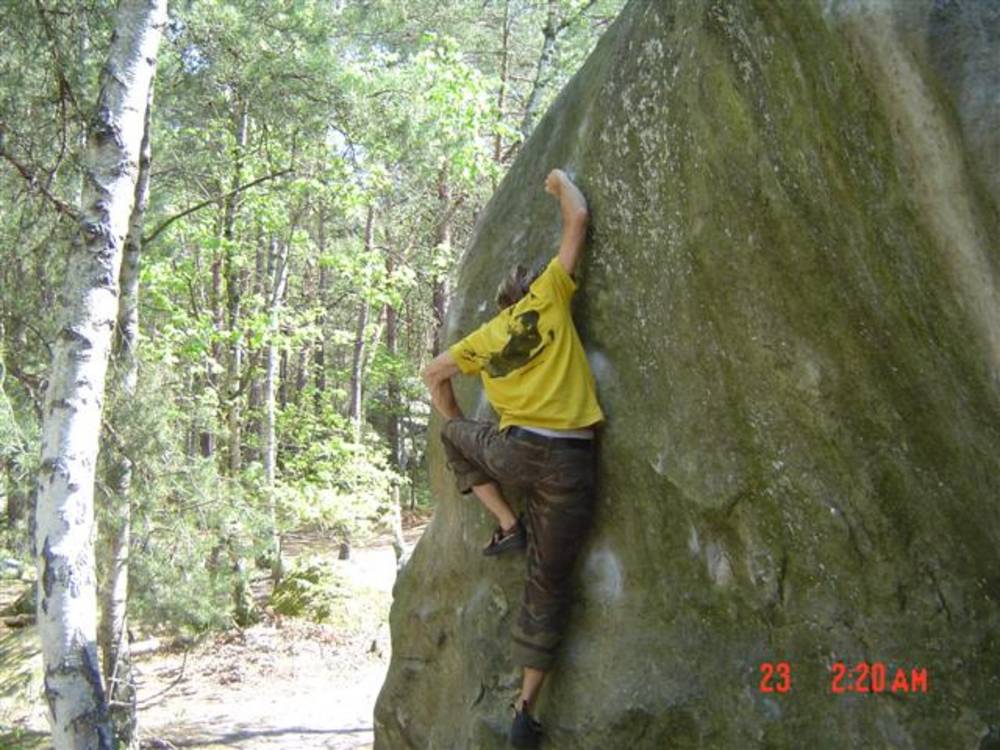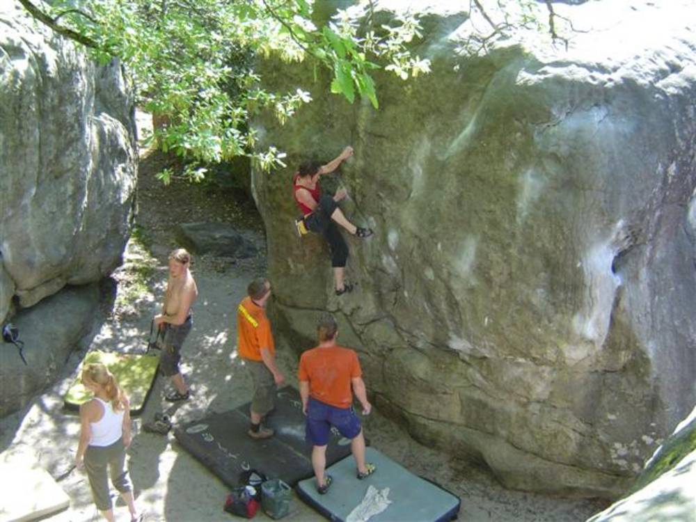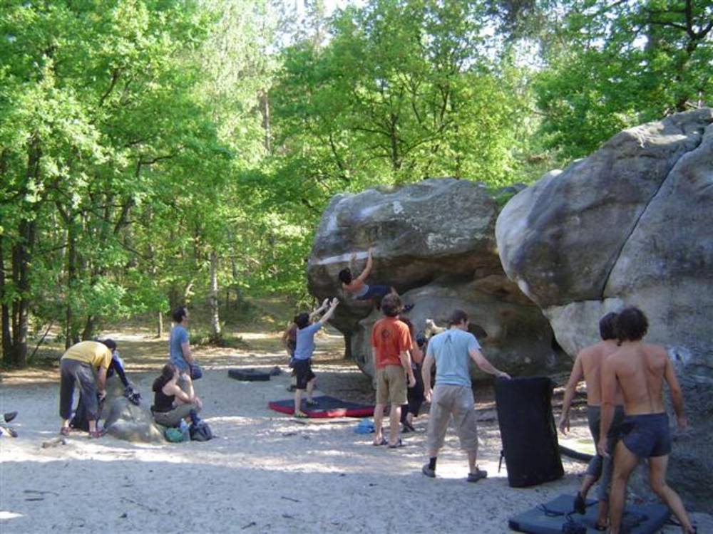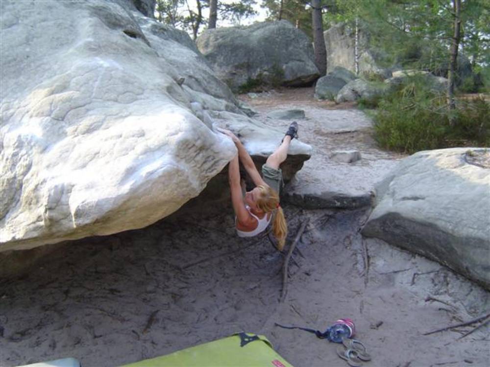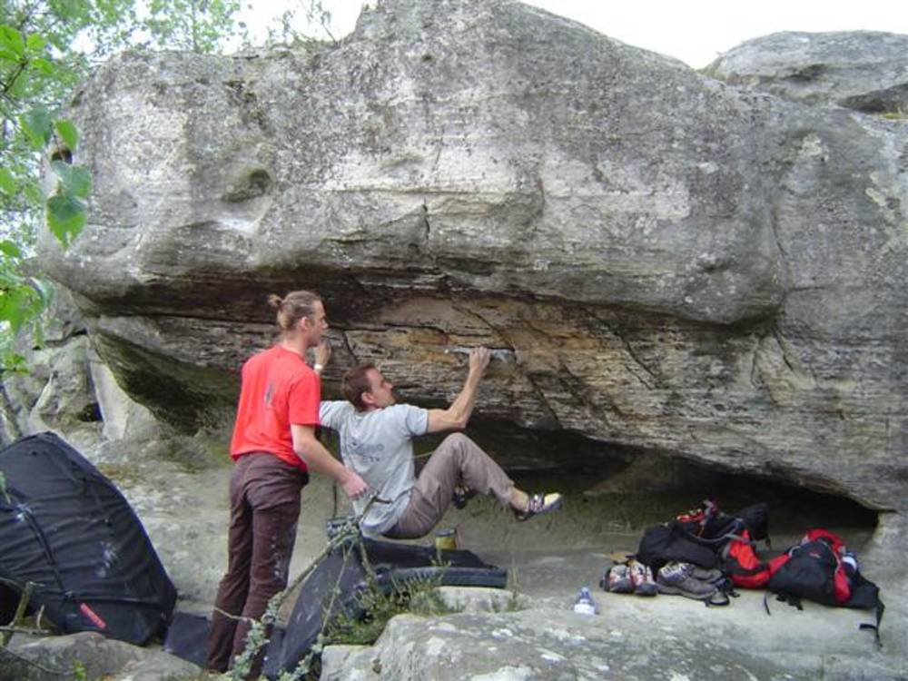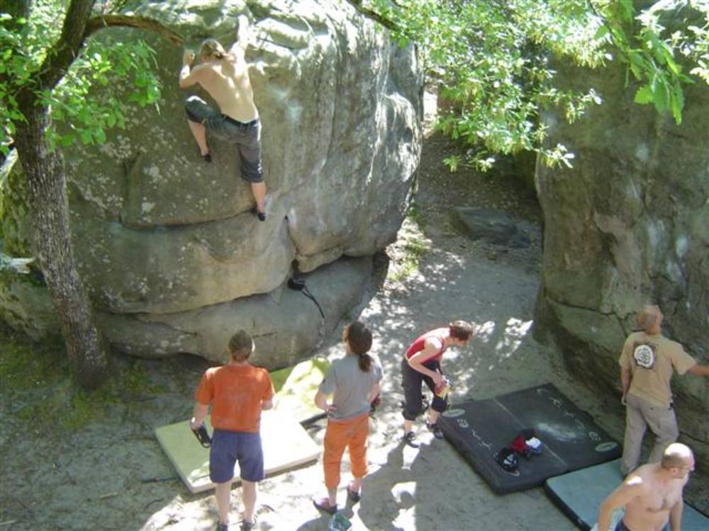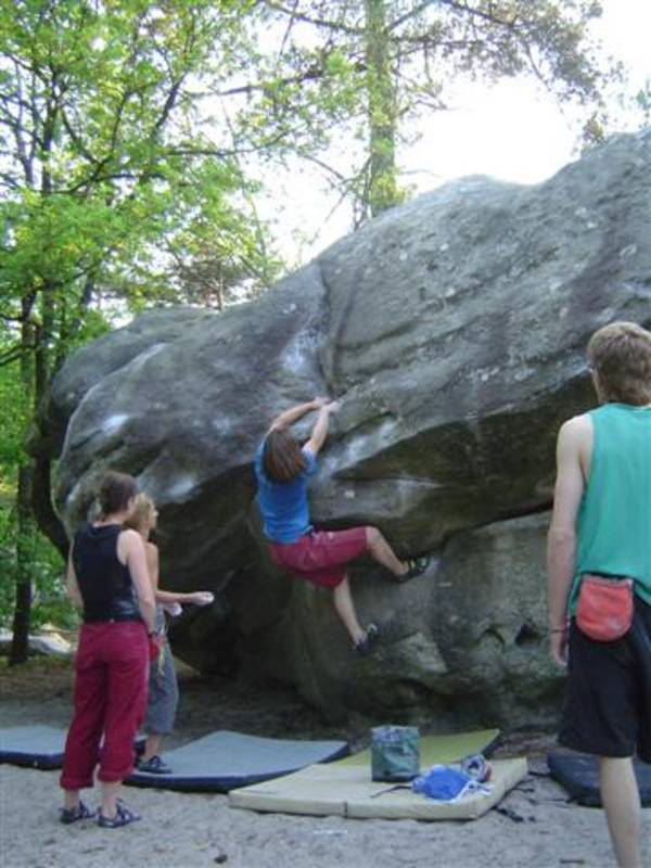 Bleau! Was soll man da noch sagen. Am ersten Tag fehlten mir die Worte als ich im Gebiet`le elephant`stand und diese Wahnsinns Blöcke sah! Überall Sand und ein Meer aus Sandsteinen! Einzigartig dieser Grip am Fels. Fantasie anregende Blöcke die dich an Elefanten,Schildgröten,Fische oder an einen Schweizer Kas erinnern. Zwei Wochen lang waren wir : Ein Team aus gut 11 Leuten, top motiviert und besuchten die schönsten Gebiete. Natürlich musste man einige Klassiker die man aus Videos kennt mal antesten. Antesten ja,den wo sich Graham,Lamprecht,Fred Nicol,Klem und wie sie alle heissen reinhängen is ja schon dann a 8 ter oder mehr notiert.`Duell´`Big Dragon``Hale Bop`und wie sie alle heissen. Geniale Routen! Ich dagegen war überglücklich als ich mir am zweiten Tag mein ersten 7a Boulder abholen konnte! `to Bip or not to bip´werd Ich nie vergessen. Ja jeder fand sich so seine lieblings Route in Bleau, ist ja auch nicht schwer bei über 15000 Boulder ! So sag Ich jeder der gern bouldert muss dort mal hin! `Sakre Bleau`Bitte seids so nett! Schauts eich des oh!